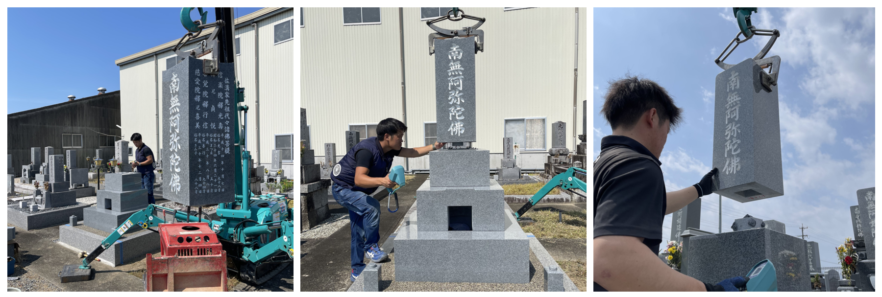 小型移動式クレーンを用いてて慎重にお墓を組み合わせます。