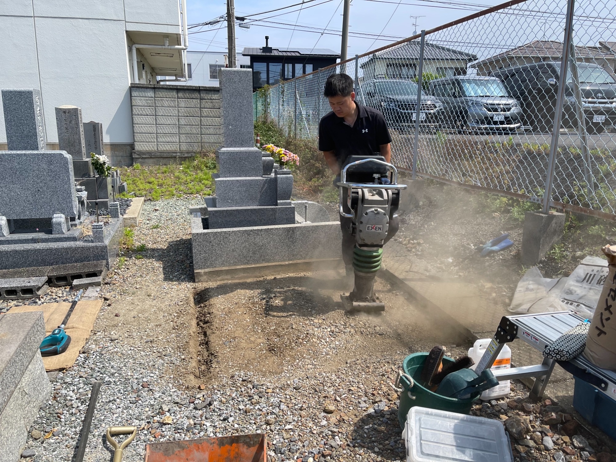 お墓は見た目だけでなく、基礎工事がとても重要です。掘削・転圧・配筋・コンクリート打設まで、ひとつひとつの工程を丁寧に行い、長く安心できるお墓づくりを行っています。
