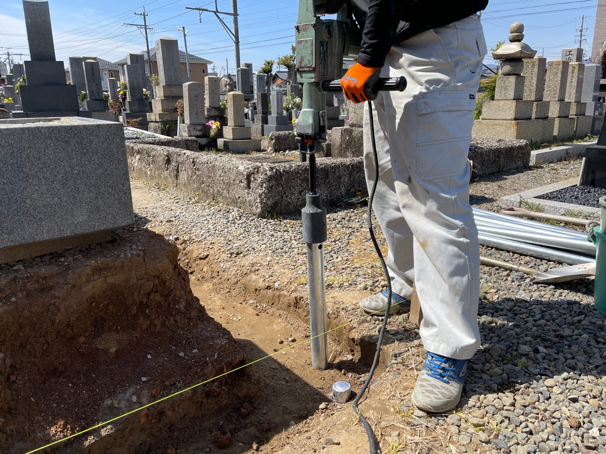 杭打ち作業 軟弱地盤には鋼管杭を地面に打ち込み、摩擦杭として機能してお墓を地中から支えます。